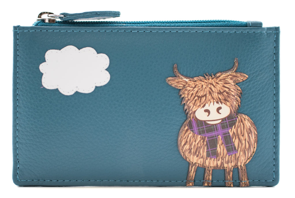 There's a Scottish themed appliqued highland cow on the front and 4 card slots on the back.