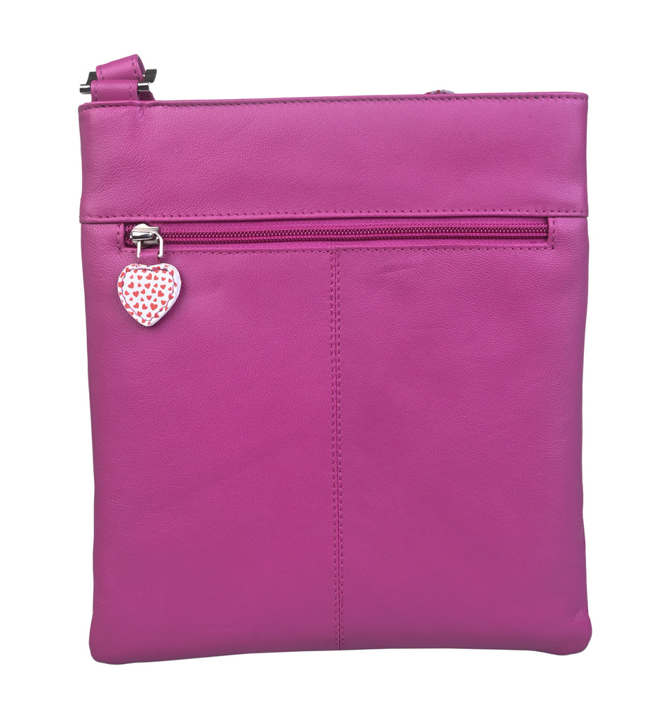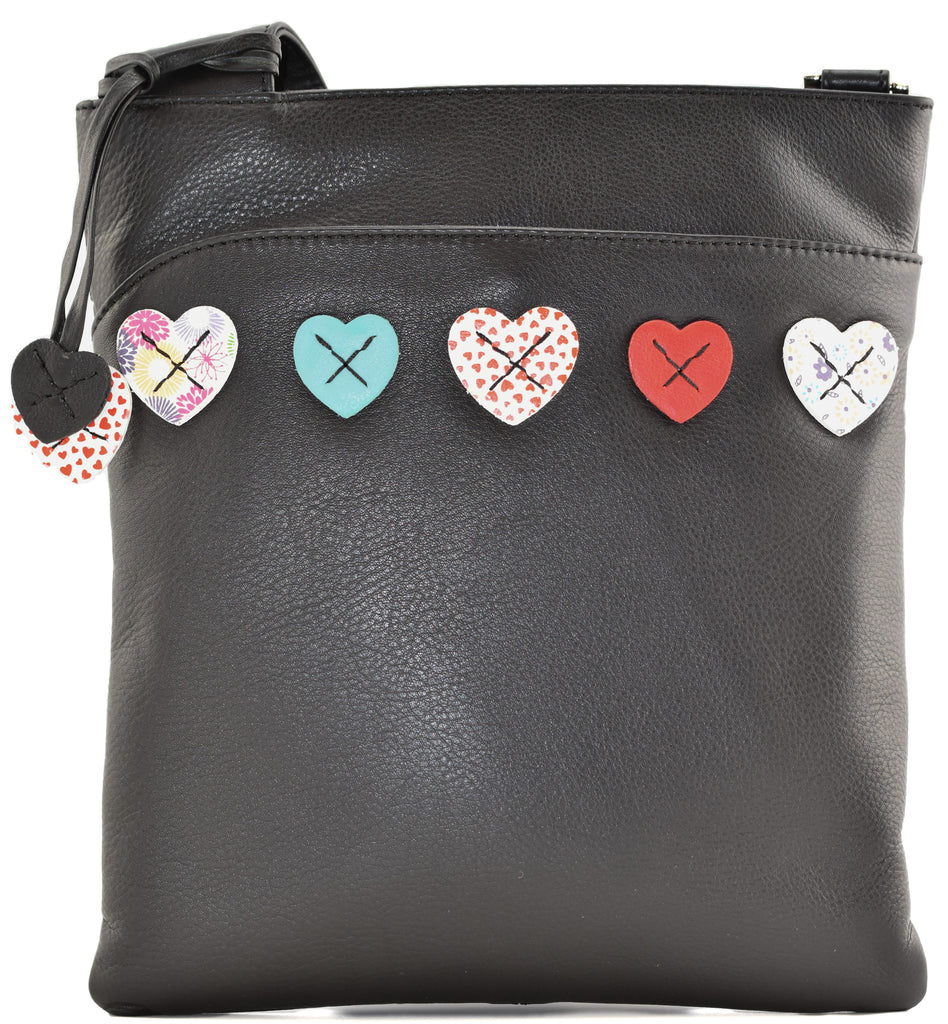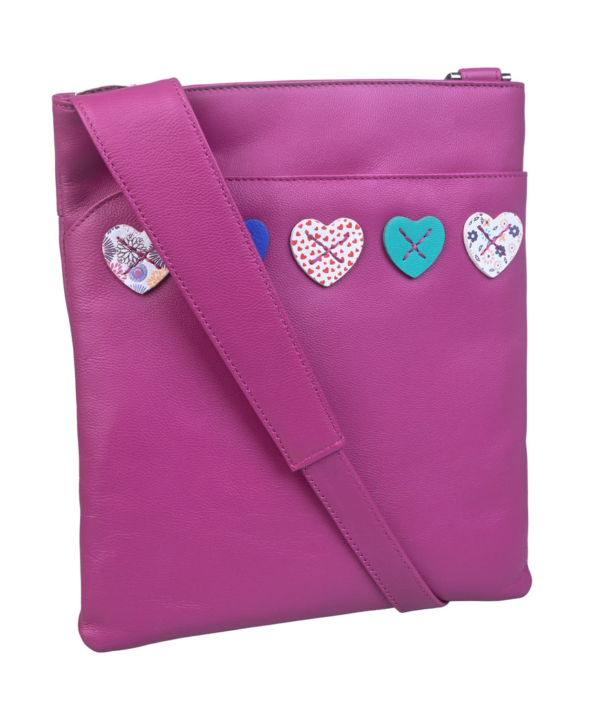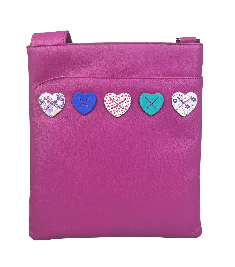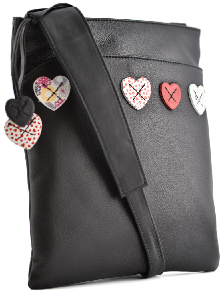 This everyday cross the body bag with beautiful appliqued hearts is light weight and comfortable. Ideal for commuting to work or shopping at the weekend, this versatile leather bag is soft and flexible.