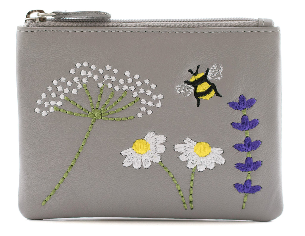 This pretty floral & bee embroidered soft leather coin purse is available in a choice of two colours.