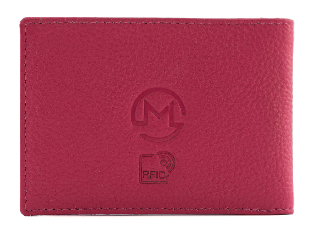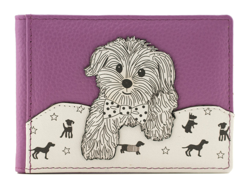 A soft leather wallet featuring a cute leather applique puppy, serving as an ID and card holder with RFID protection.