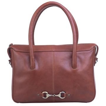An equestrian inspired leather grab bag in a veg tanned leather with an antique brass snaffle bit fitting on the front.