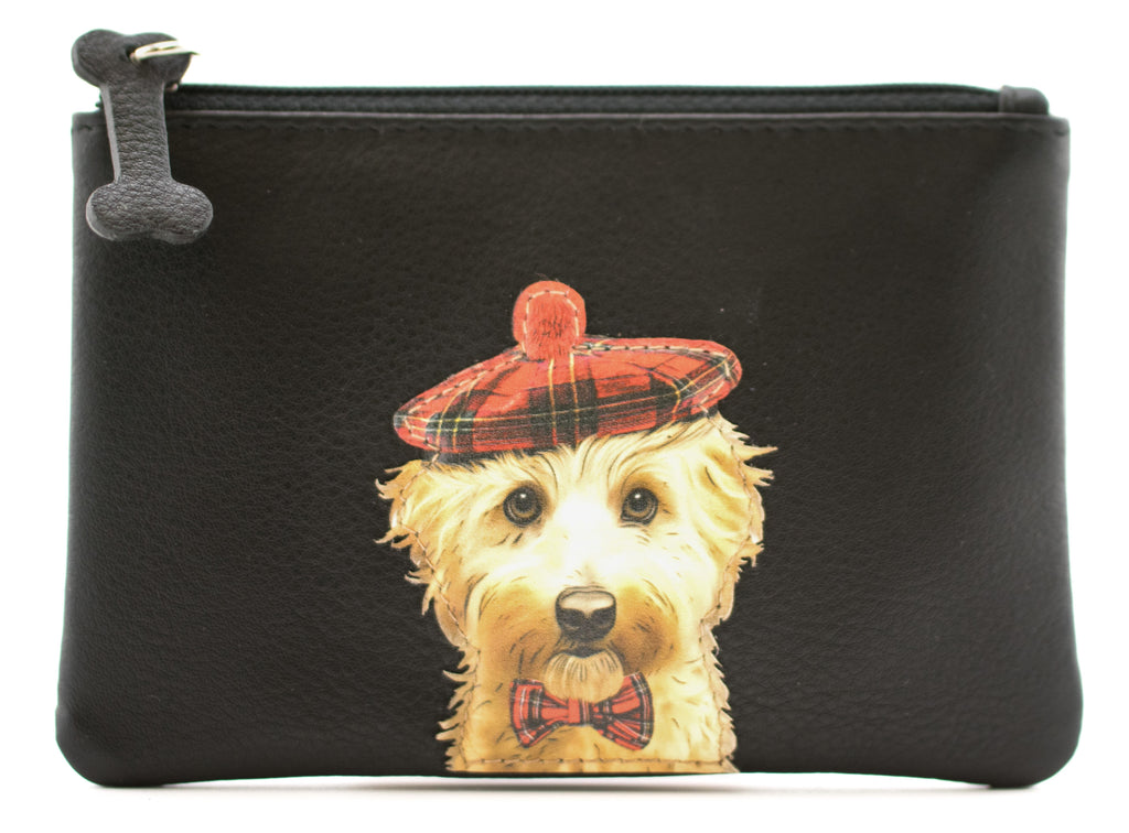 Soft leather coin purse with zip opening, showcasing a charming dog in a tartan hat and bow tie applique.