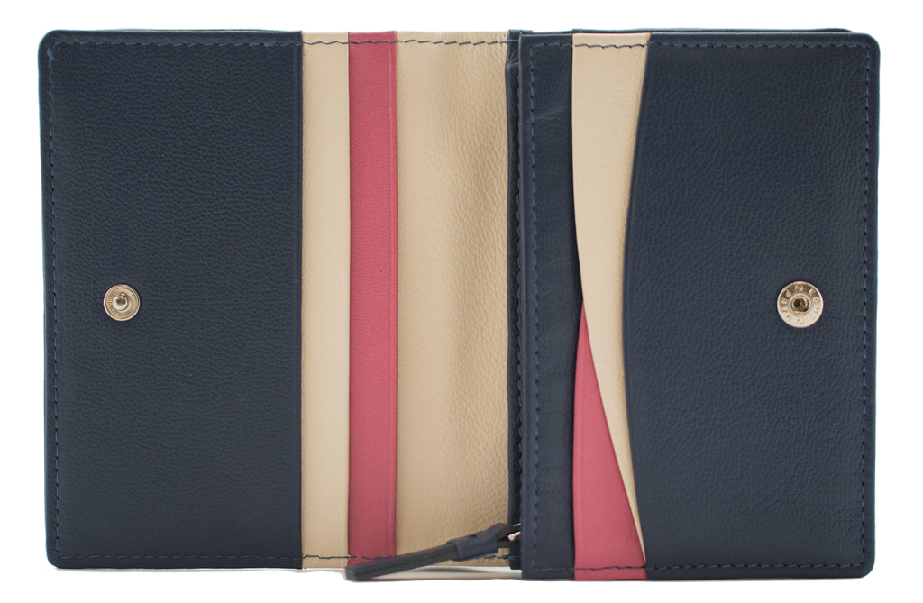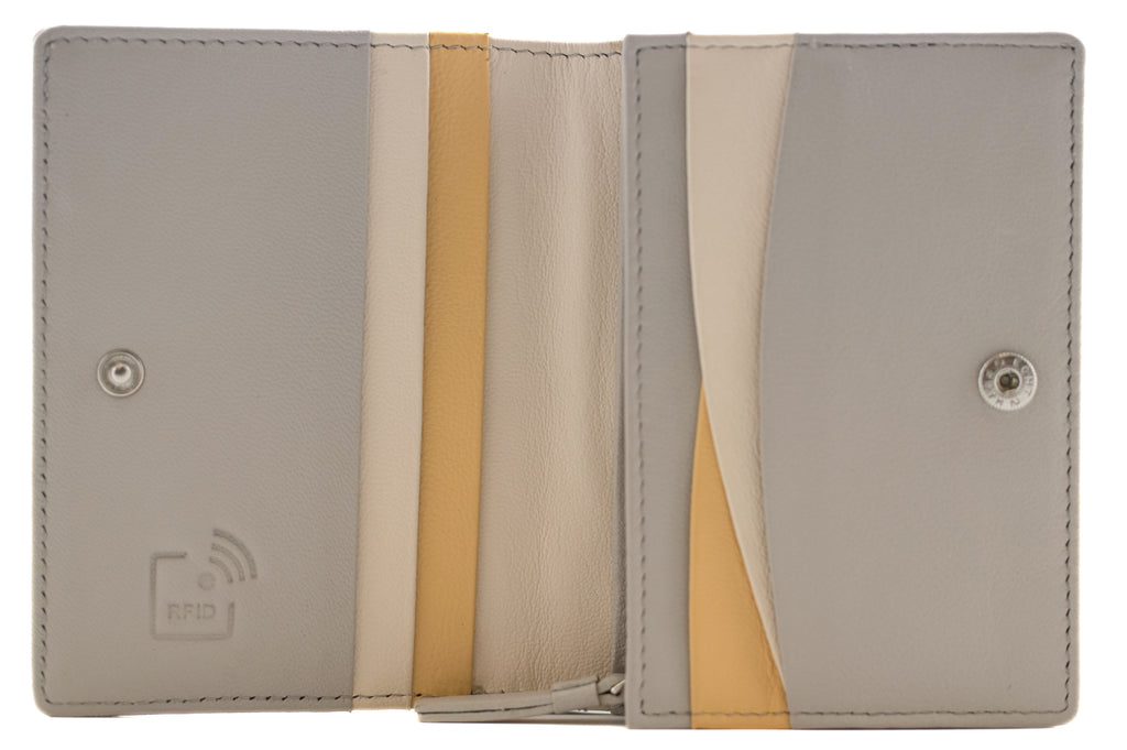 The interior features a zipped coin pocket, card slots, and a note pocket for organization. Compact and lightweight, this handy purse also has built in RFID protection.