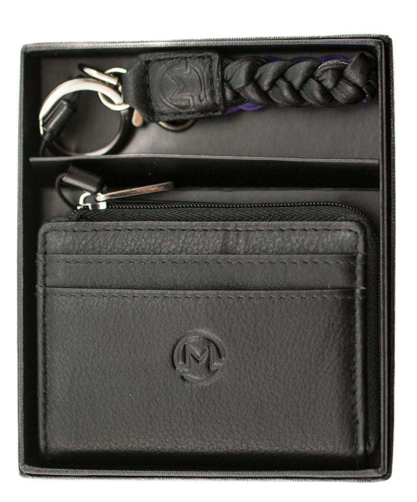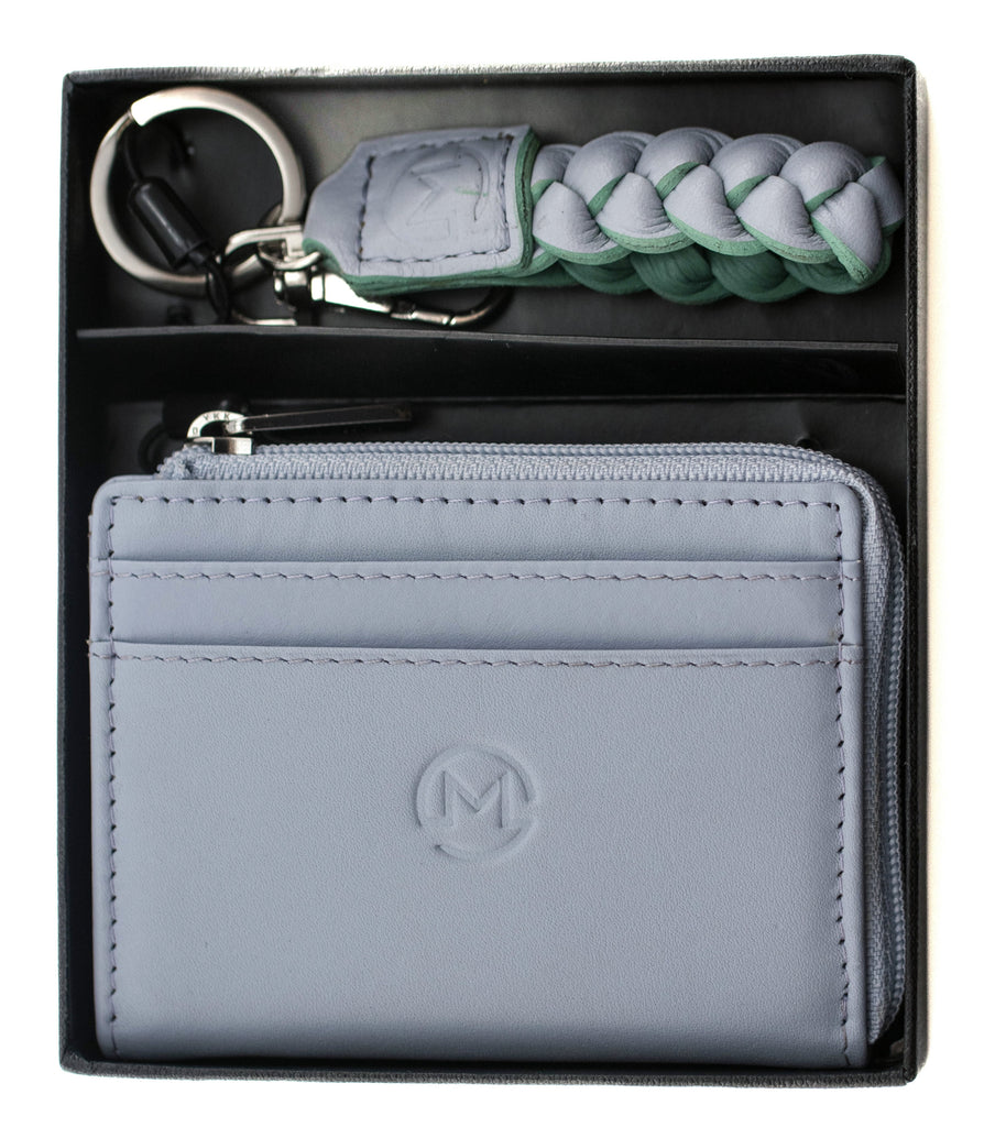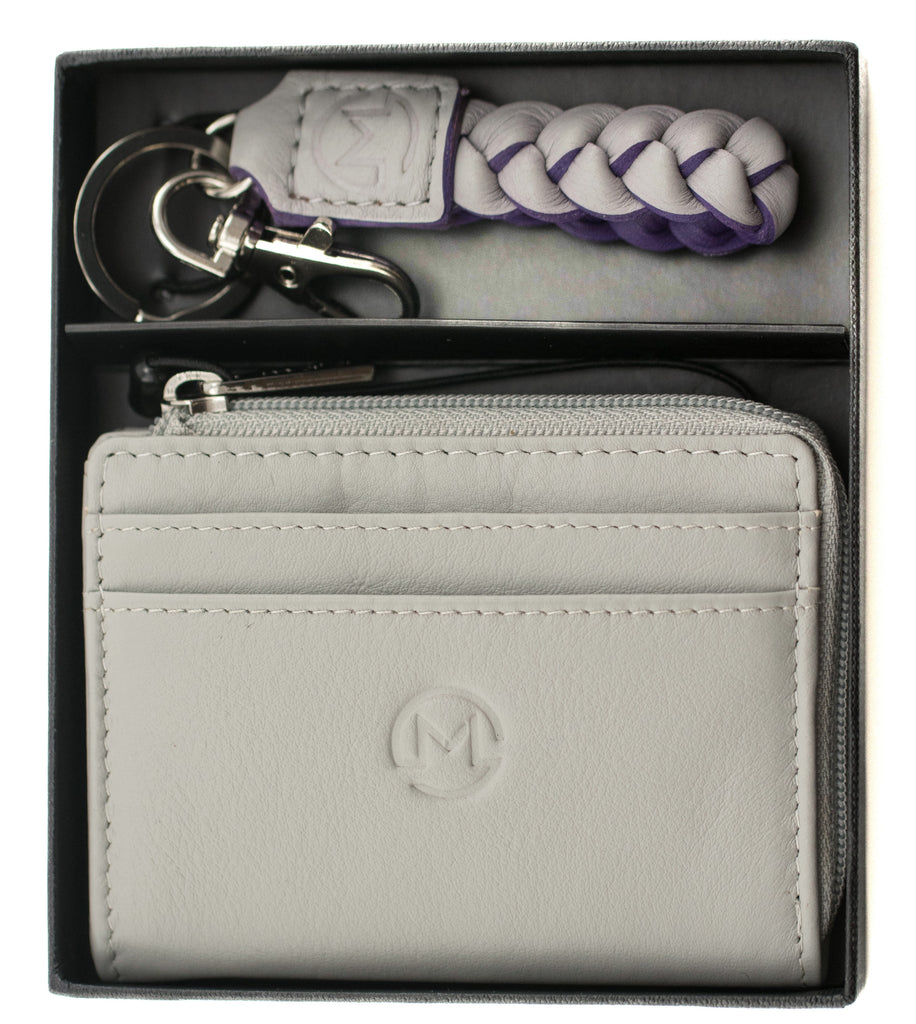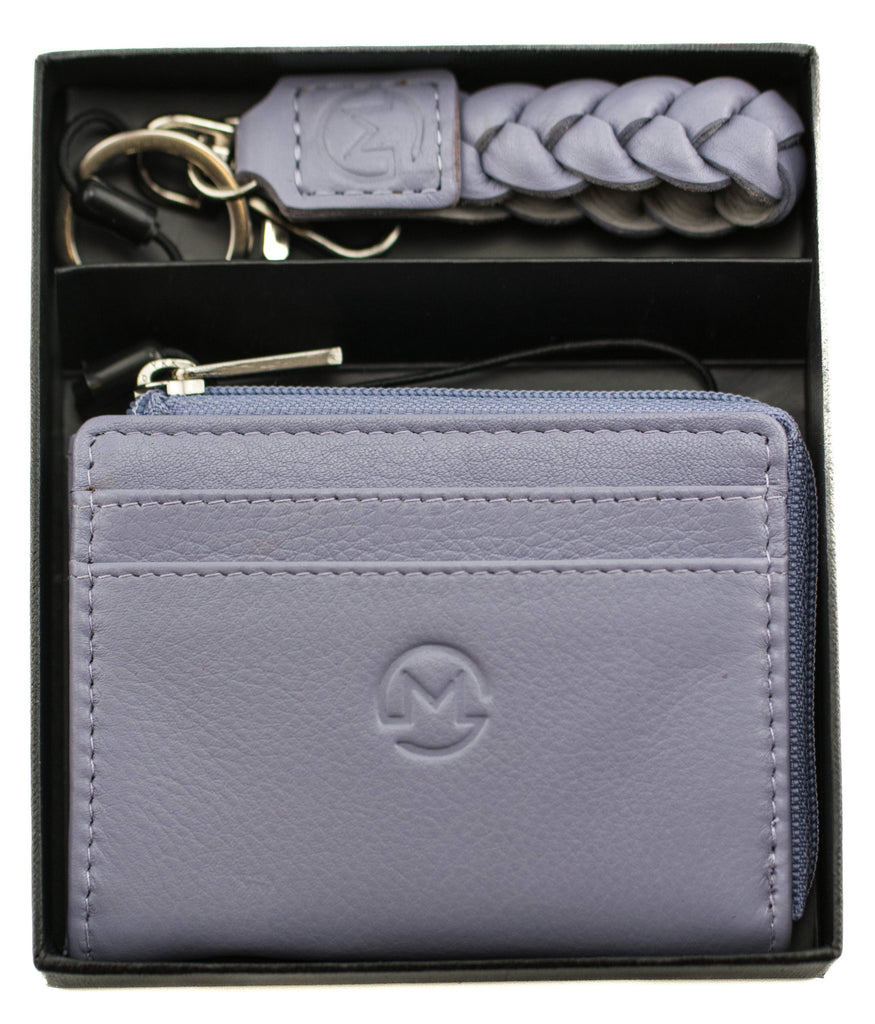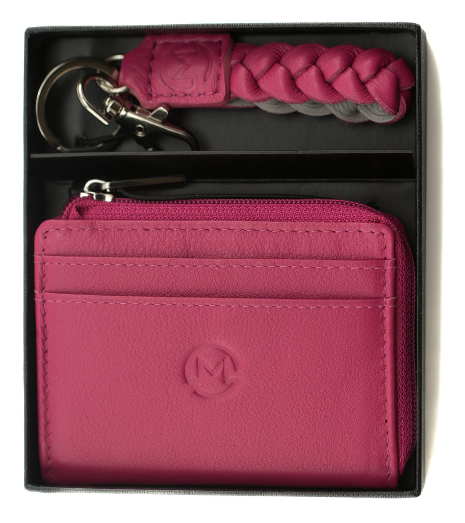 Elegant ladies gift set featuring a leather coin purse with 4 card slots and a matching keyring, presented in a gift box.