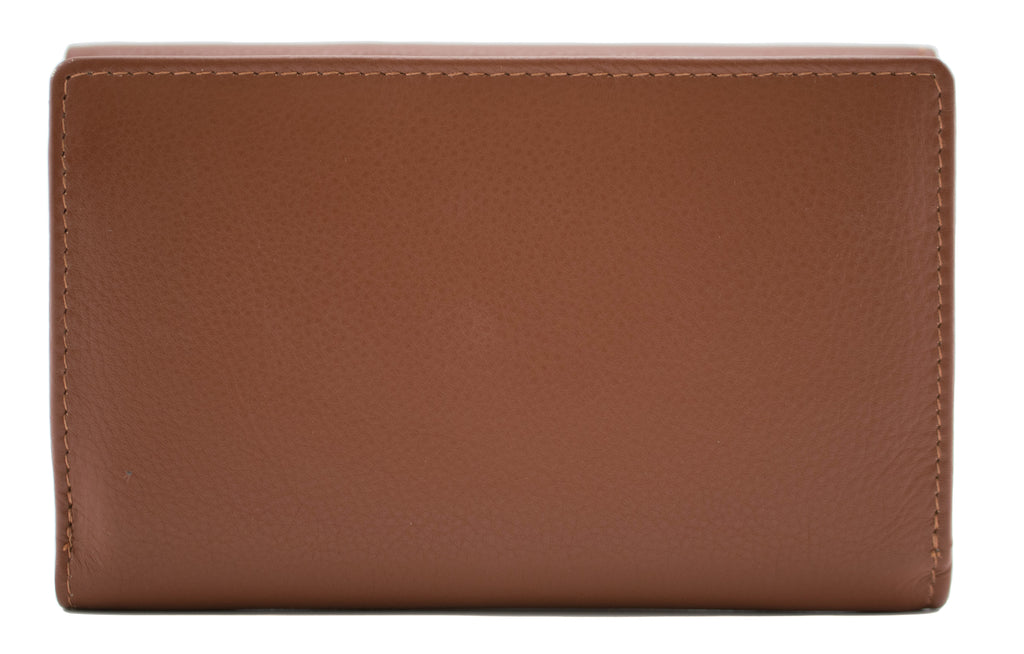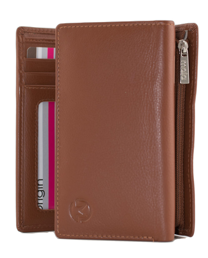 Spacious leather tri-fold purse equipped with RFID protection and a secure zipped compartment for coins.