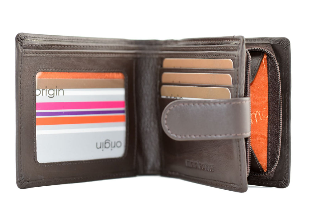 Neat and compact, this soft leather wallet holds 3 cards, has an internal ID window, double note section and outer zipped change tray. Available in black and brown and is packaged in a box.