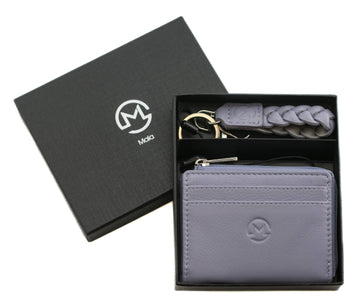 Elegant ladies gift set featuring a leather coin purse with 4 card slots and a matching keyring, presented in a gift box.