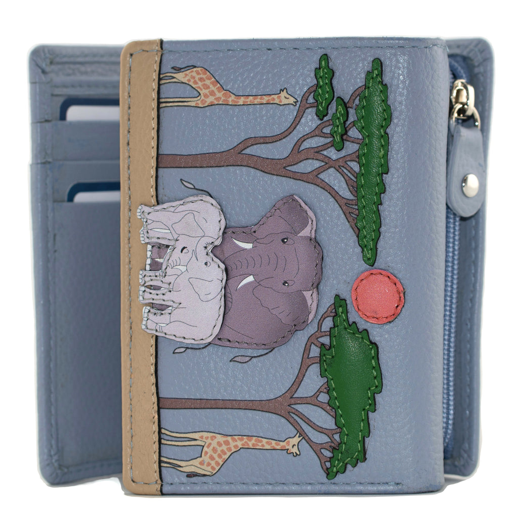 Compact leather tri-fold purse featuring a safari scene applique and print showcasing elephants and giraffes, perfect for smaller bags.