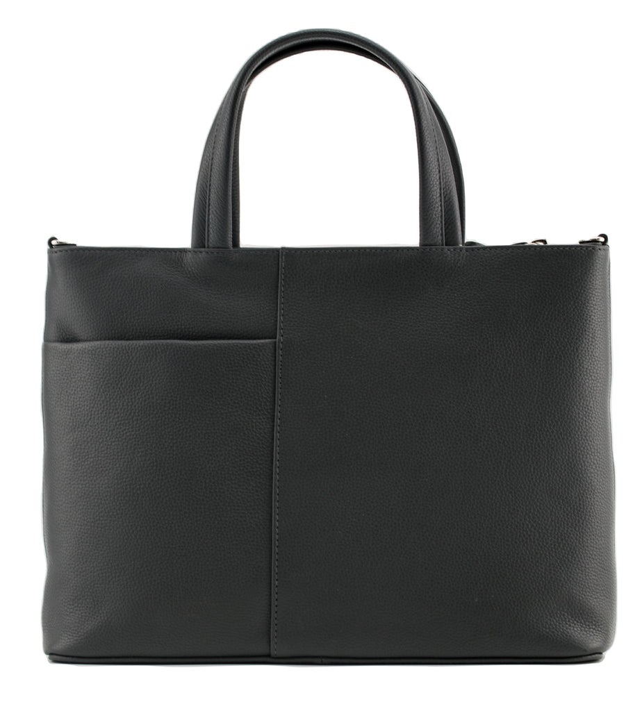 The bag features a convenient slip pocket on the back and includes a detachable shoulder strap for versatile carrying options.