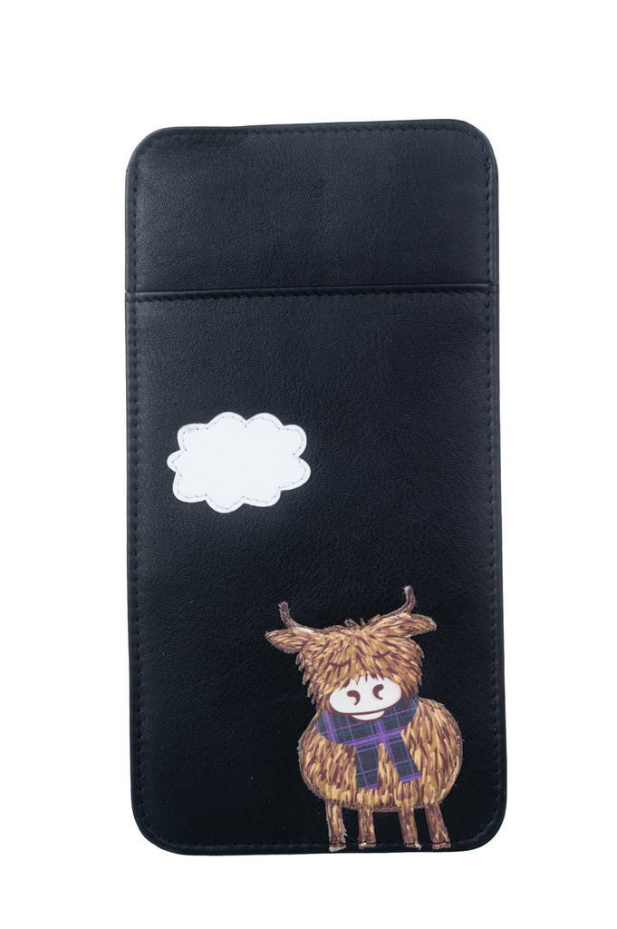 The top opens easily and fits most sizes of glasses. On the front of the case there's a useful slip pocket for a cleaning cloth and appliqued highland cow.