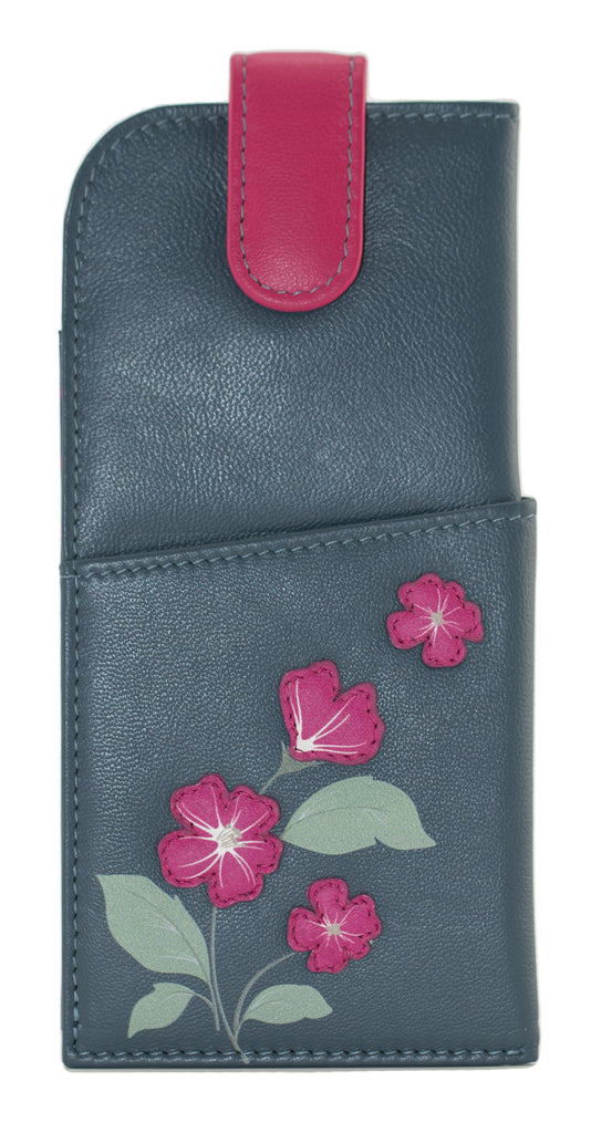 Handmade from genuine soft leather, this beautiful Japanese appliqued flower glasses case holds most sizes of glasses.
