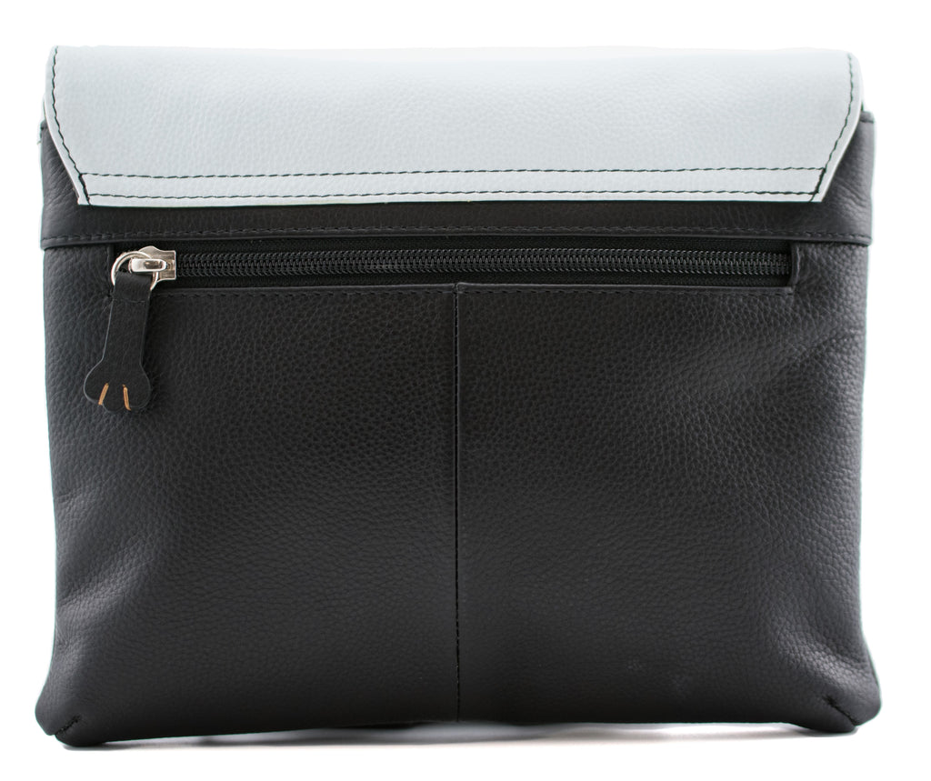 Underneath the flap you'll find a useful slip pocket and the main compartment has a zip closure. Within the main compartment there's a slip pocket and zip pocket. The strap has a buckle so you can adjust the length and the back of the bag has a zip pocket.