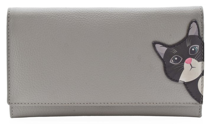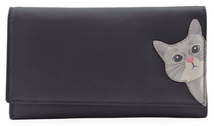 A cheeky cat design leather purse with Cleo the cat applique design on the front and back of this leather purse which is available in 3 colours.