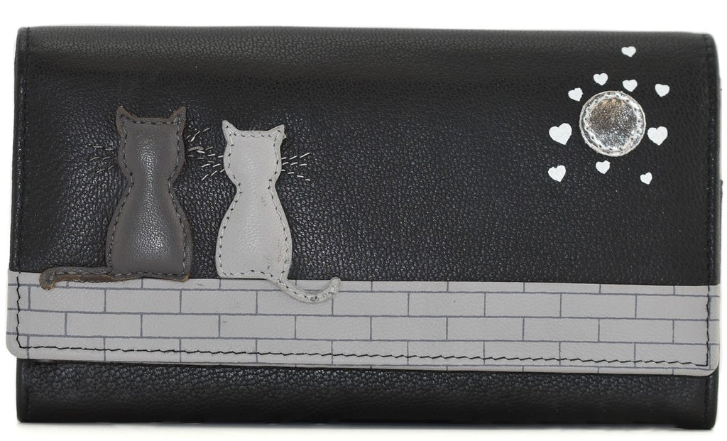 Made from gorgeous soft leather, this purse is finished off with two appliqued cats starring lovingly into the midnight sky.