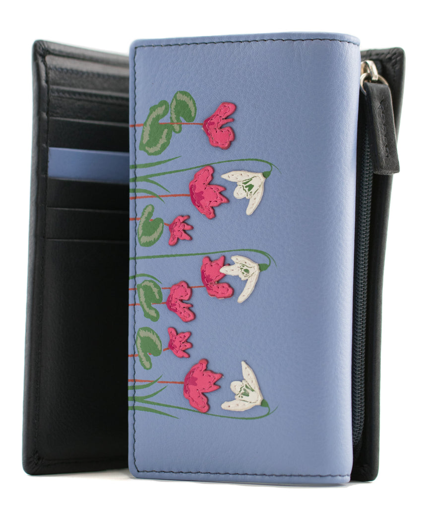 A stylish leather tri-fold wallet adorned with snowdrop and pink flower appliques.