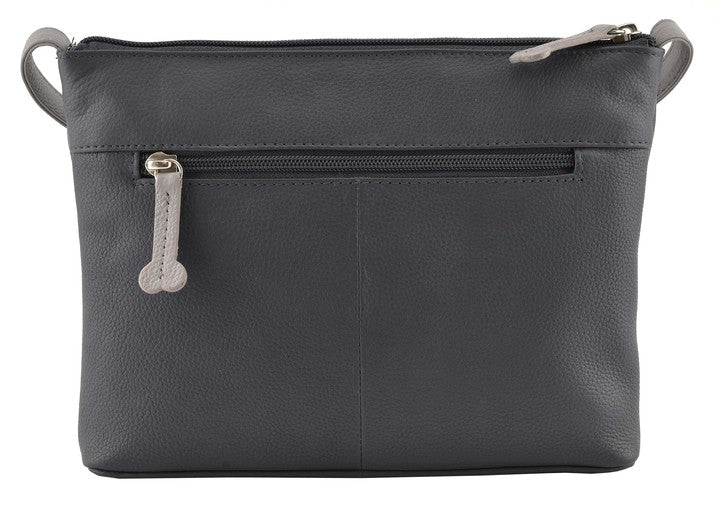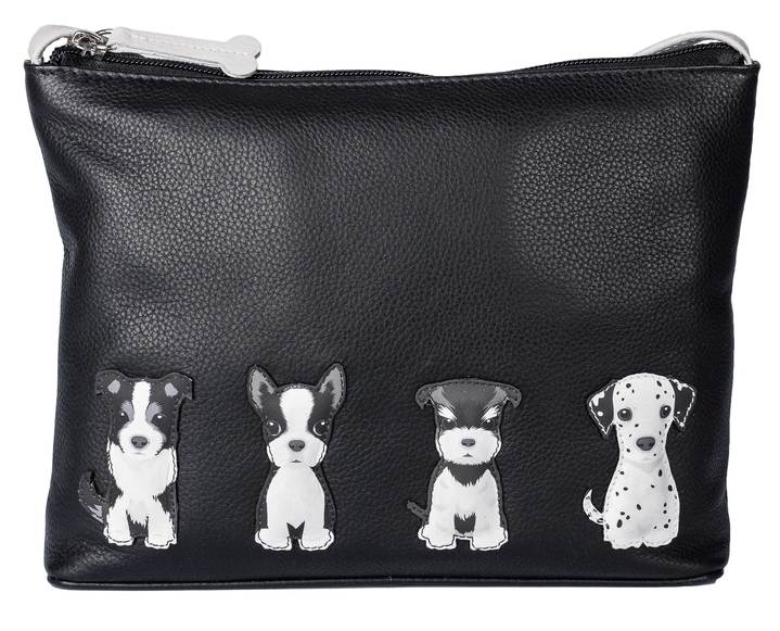 This practical zip top bag can be worn across the body, or shortened at the strap to wear on the shoulder. Available in two colourways, there's a choice of grey leather with multi coloured dogs or black leather with black and white dogs.