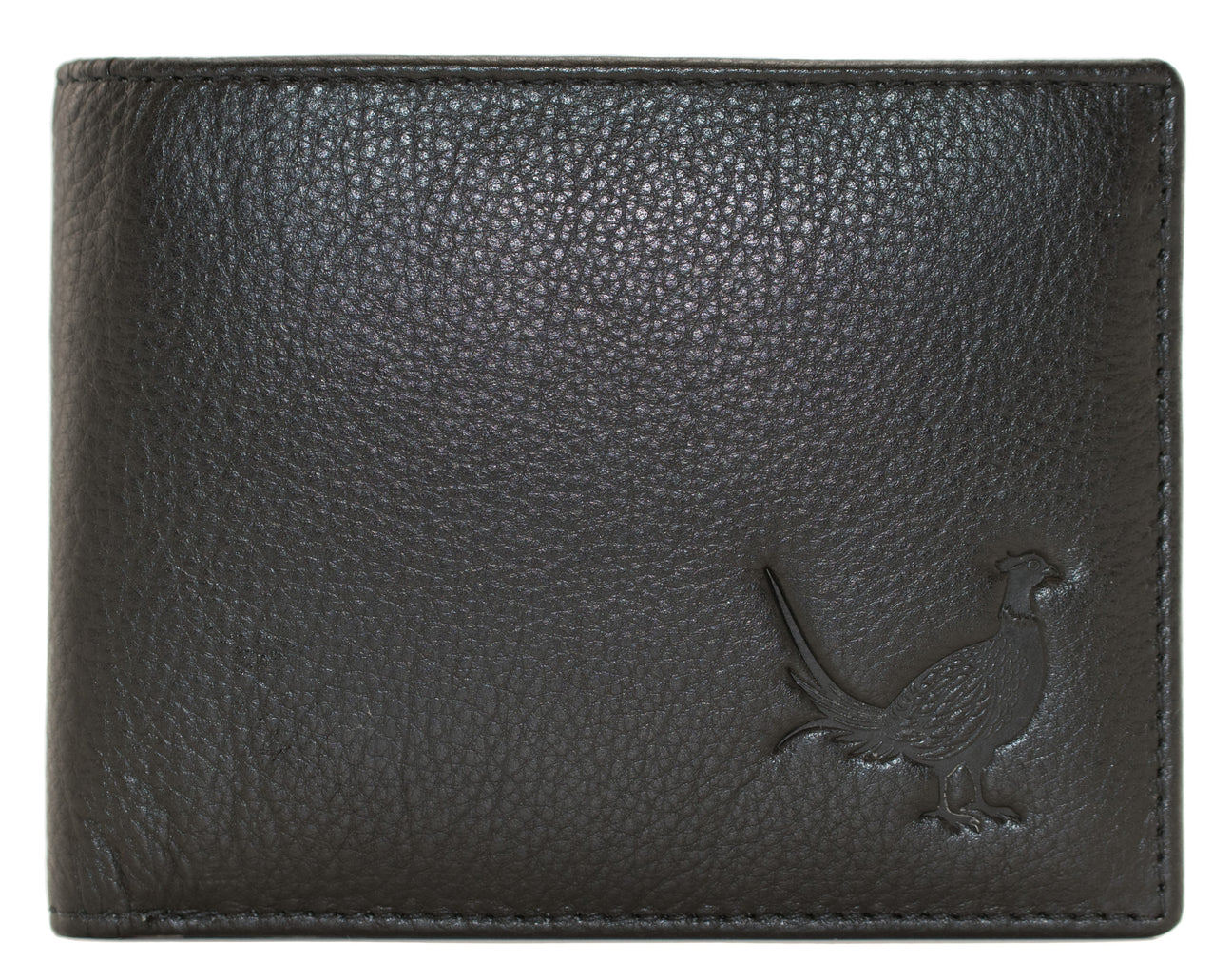 Sleek bifold black leather wallet featuring a stylish pheasant logo in the corner, showcasing elegance and craftsmanship.