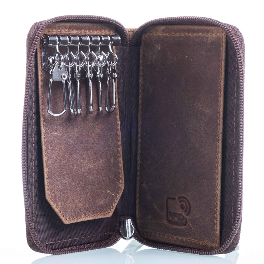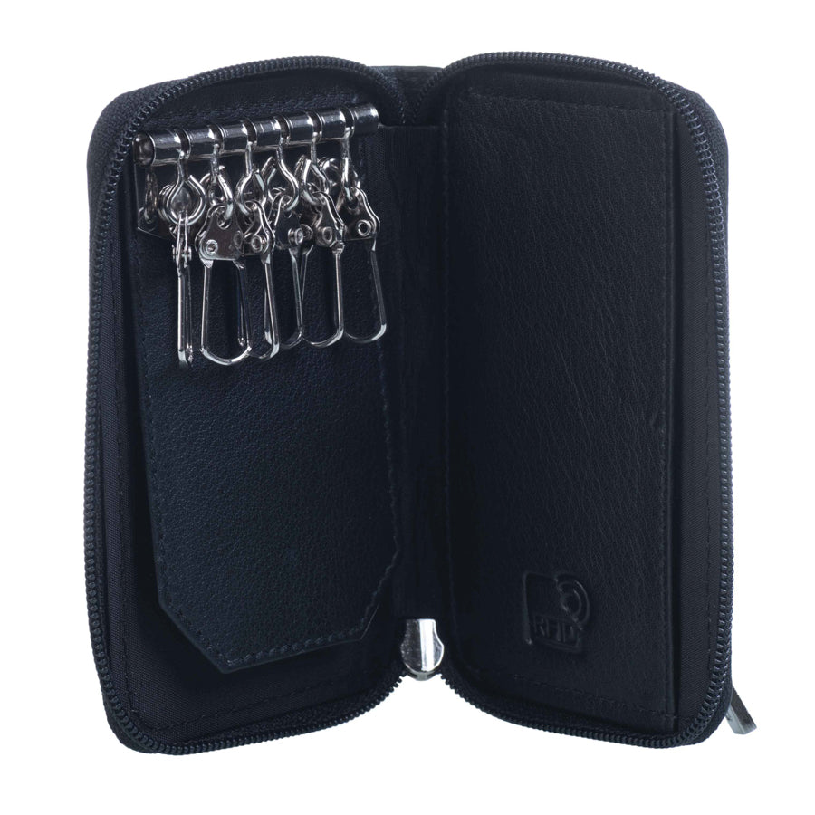 Neat and compact, this genuine leather zip around key case has 6 single key hooks and external zip pocket. Available in 2 colourways and packaged in a box.