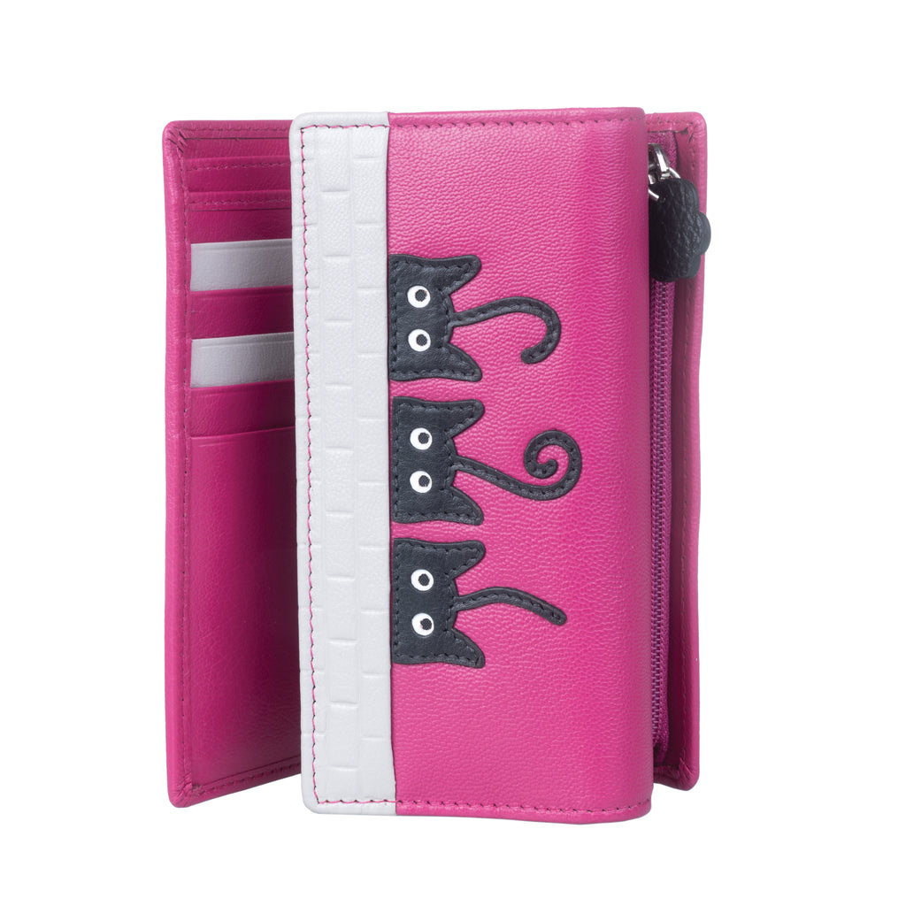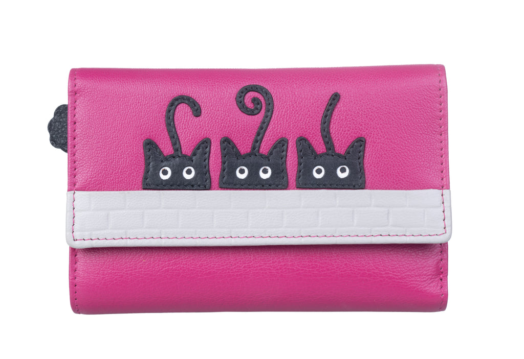 This functional purse has been lovingly created from smooth leather and finished with three cute cats peeking over a wall.