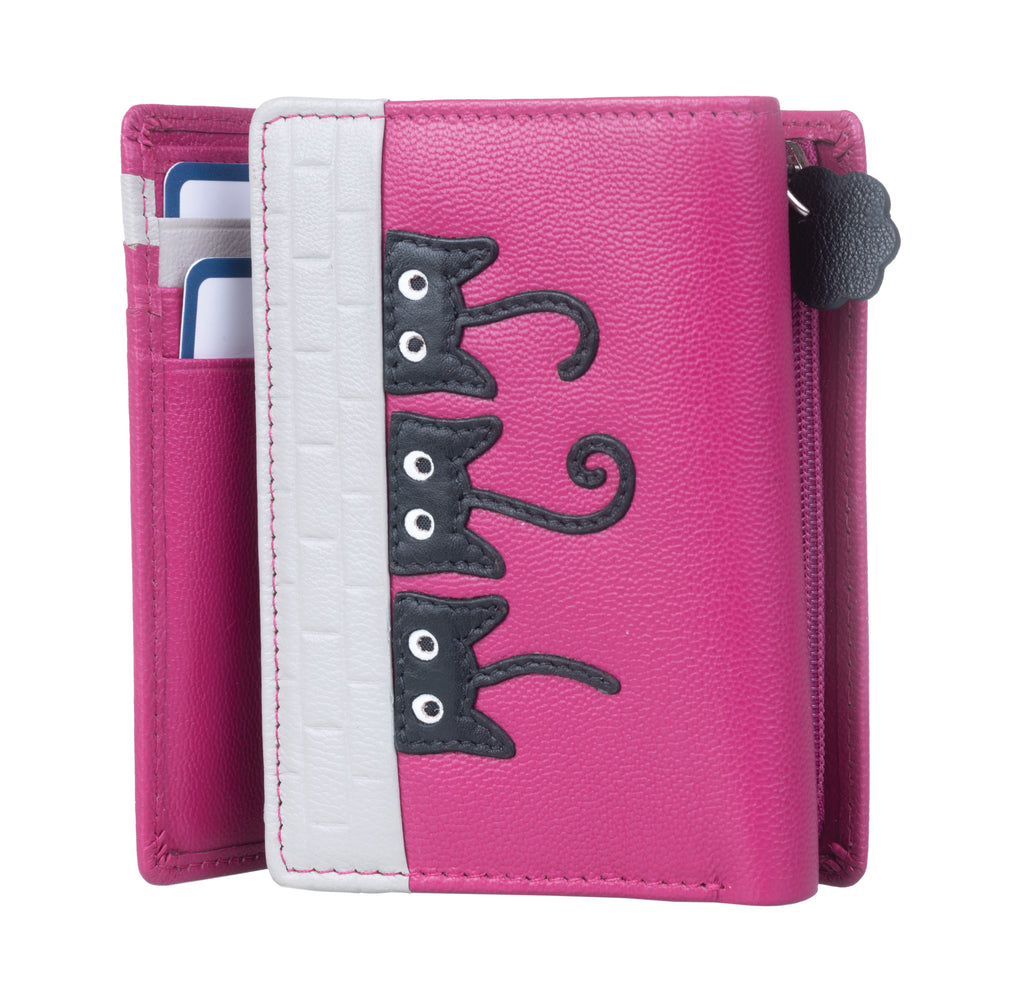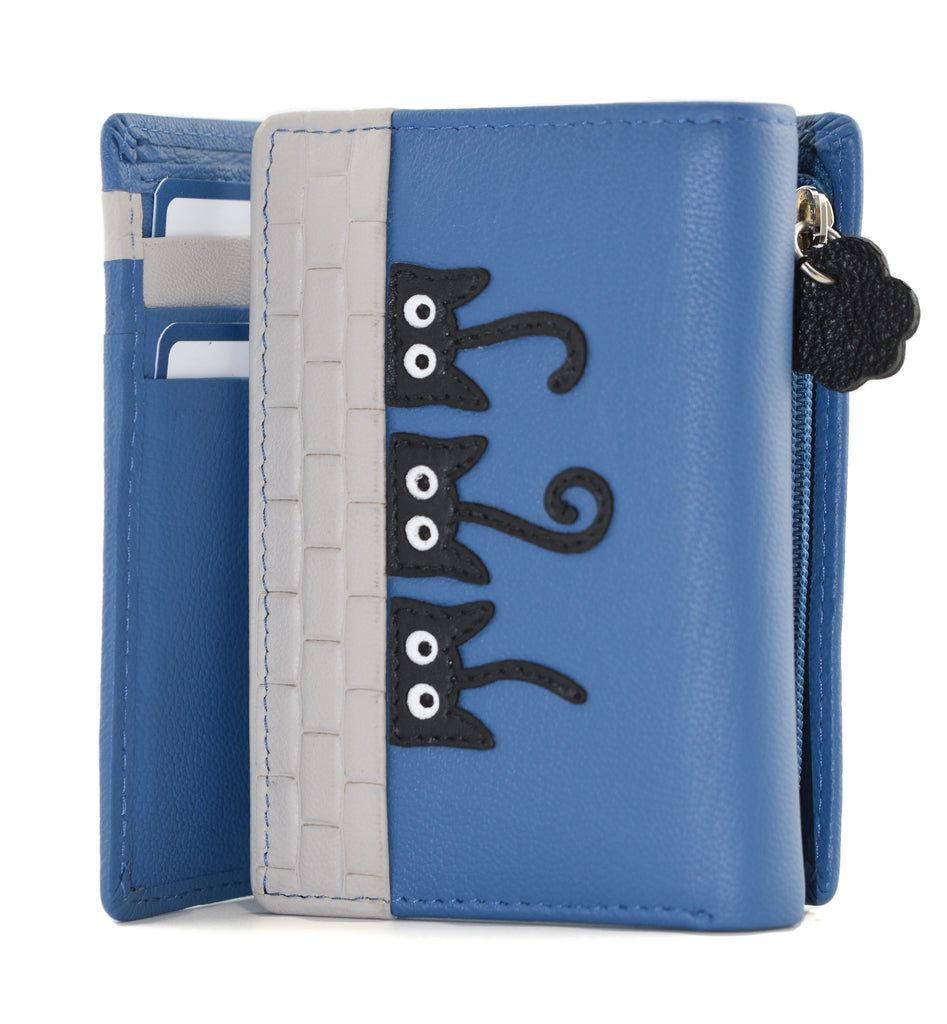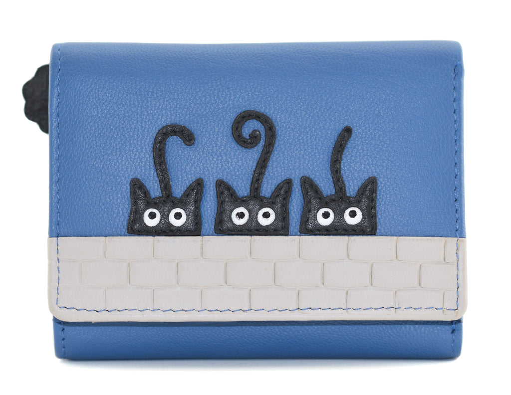 Compact and lightweight, this gorgeous leather tri fold purse has three mischievous black cats peeking over a wall.